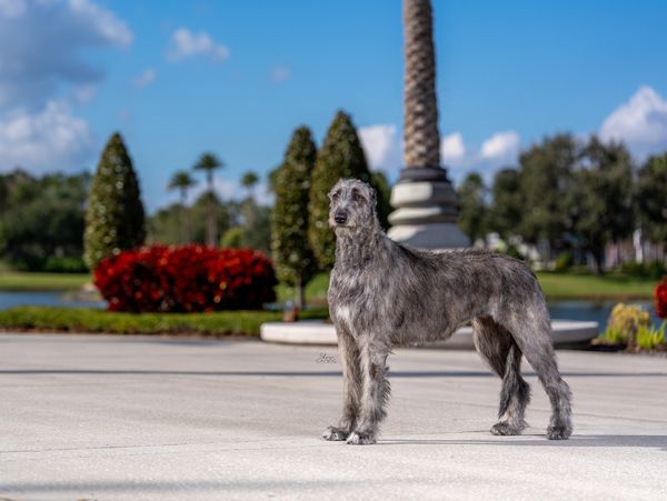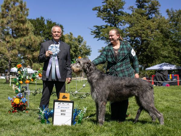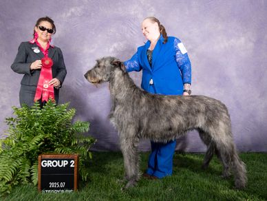 She has earned a Best Puppy in Specialty Show win, Multiple Regular Group Placements, Multiple Owner-Handled Group Placements, Multiple Owner-Handled Group Wins, & was the 2025 Irish Wolfhound Club of America Select Bitch.